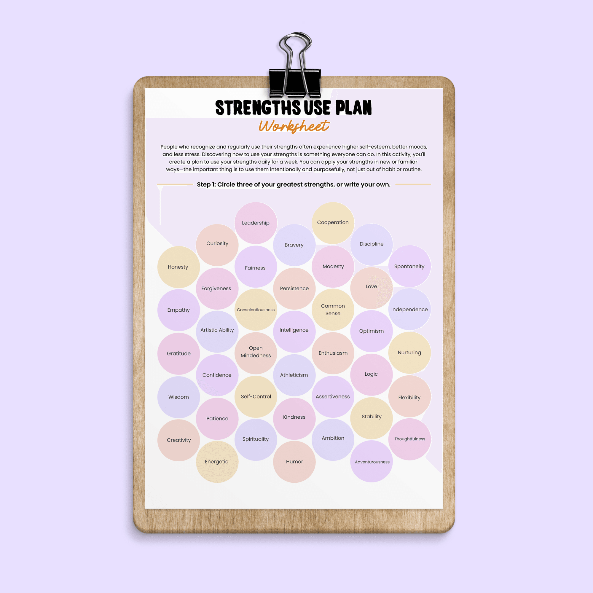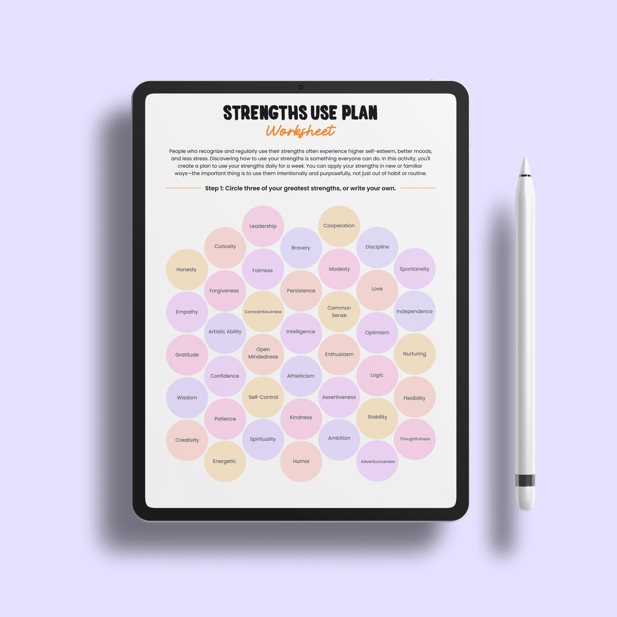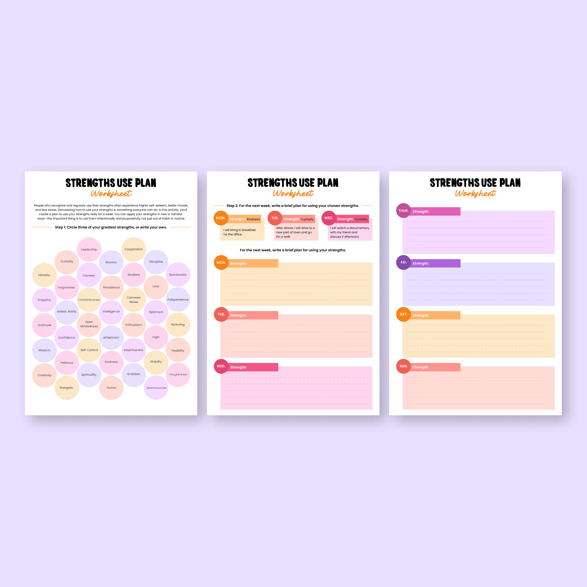 ✦ INSTANT DOWNLOAD: 3-PAGE STRENGTHS USE PLAN WORKSHEET ✦
